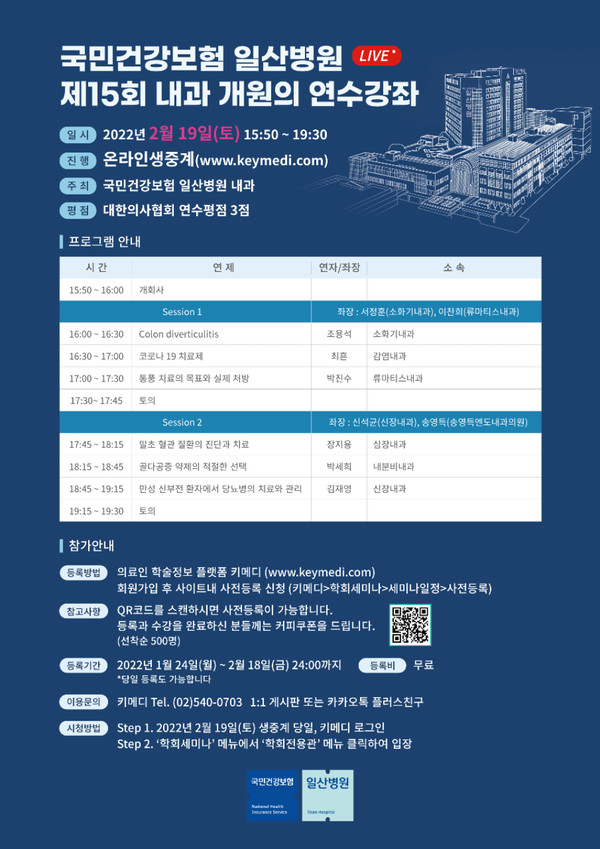 [고양신문] 국민건강보험 일산병원(병원장 김성우)이 오는 19일(토) 오후 4시부터 제15회 내과 개원의 온라인 연수강좌를 개최한다.