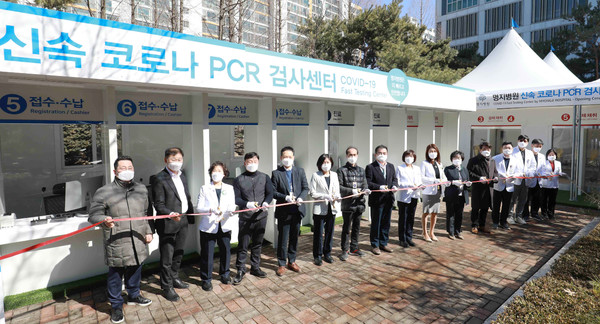 명지병원(이사장 이왕준)은 2일 오후 오미크론 확산에 따른 코로나 PCR 검사 수요 폭증으로 인한 검사역량을 대폭 확대하기 위해 4시간 만에 검사결과를 확인할 수 있는 ‘신속 코로나 PCR 검사센터’ 개소식을 했다.