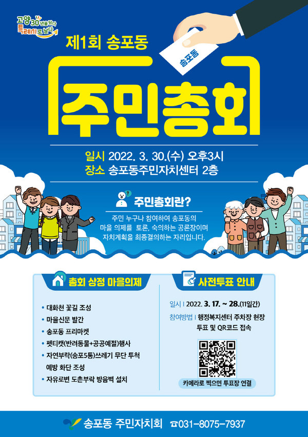 일산서구 송포동 주민자치회가 3월 17일부터 28일까지 12일간 송포동 주민총회 마을의제 사전투표를 온·오프라인으로 진행한다. 송포동 행정복지센터 정문과 송포농협 앞 버스 정류장 등에서 사전 현장투표와 온라인으로 진행되고 있다.