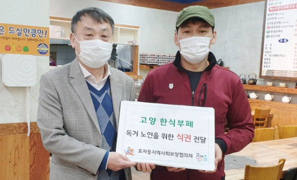덕양구 효자동에 위치한 고양한식부페(대표 이화동)가 식사 해결이 어려운 지역의 독거노인을 위해 지난 3월 24일 효자동 지역사회보장협의체에 식권 60매를 전달했다. 고양한식부페는 관내 저소득 독거노인을 위해 지난해부터 매월 정기적으로 식사권을 전달해 이웃사랑을 실천하고 있다.