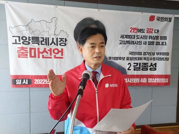 [고양신문] 국민의힘 길종성 독도사랑회 회장이 고양시장 출마를 선언했다. 길종성 후보는 28일 고양시의회 영상회의실에서 열린 출마 기자회견을 통해 “잃어버린 고양시 12년, 통렬히 반성한다”며 출사표를 던졌다.