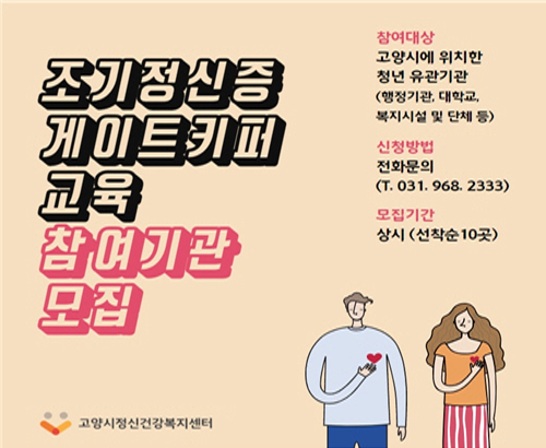 고양시정신건강복지센터는 참여기관을 선착순 10개소를 모집하며, 기간은 상시 모집이다. 자세한 문의와 교육 신청은 고양시정신건강복지센터 청춘나래팀(031-968-2333)으로 하면 된다.