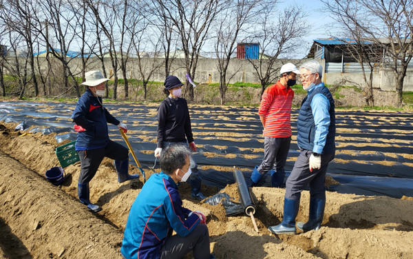 일산서구 대화동 주민자치회(회장 손종환)와 통장협의회(회장 석형수)가 지난 3월 29일 ‘이웃사랑 감자심기’를 진행했다. 구산동 이웃사랑 나눔텃밭 1,322㎡(403평)에서 주민자치위원과 통장협의회, 김운남·심홍순 고양시의원 등이 함께 참여해 구슬땀을 흘리며 감자씨 80㎏을 파종했다.