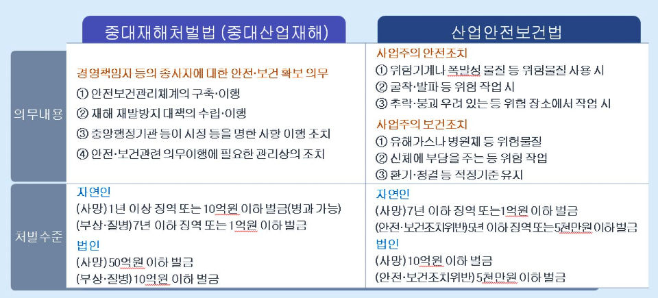 중대재해처벌법은 안전보건 확보의무를 이행하지 않음으로써 인명피해를 발생하게 한 사업주 나 경영책임자 등의 처벌을 규정함으로써 중대재해를 예방하고 시민과 종사자의 생명과 신체를 보호하고자 하는 법이다. 권한과 책임이 있는 사람이 안전보건관리체계 구축 등 안전과 보건 확보의무를 이행함으로써 안전보건조치가 철저히 이루어지도록 해서 중대산업재해를 예방하자는 것이 법의 취지다.