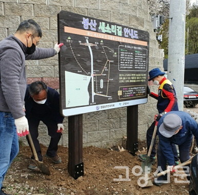 [고양신문] 고양시 창릉동행정복지센터(동장 이병영)와 창릉동 주민자치회(회장 임현철)가 13일 창릉동 산책길 제3코스 ‘봉산 새소리길’ 개발을 알리는 행사를 열었다. 주민자치회 위원과 행정복지센터 직원 등 20여 명이 참여한 이날 행사에서 서오릉 건너편에 위치한 봉산(208m) 산책길 중 용두동 지역의 코스를 안내한 ‘봉산 새소리길’ 안내판을 설치하고, 서오릉상친회(회장 원종호)와 함께 봉산 새소리길 여러 곳에 나무로 제작한 새집을 매달아 길을 단장했다.