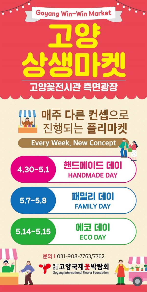 (재)고양국제꽃박람회(대표이사 김운영)가 일산호수공원 고양꽃전시관 인근 광장(측면 광장)에서 4월 30일부터 5월 14일까지 매주 주말(토·일) 고양시 내 협동조합과 소상공인이 참여해 다양한 화훼류 관련 상품을 판매하는 고양 상생마켓을 연다.