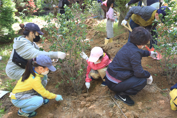 나무를 심을 한쪽에는 몇몇 주민이 파란색 호스로 나무를 심을 구덩이에 물을 담고 있었다. 주민들은 안전한 나무심기를 위해 국민체조로 몸을 풀었다. 뽑기로 나무 심기의 위치를 정했다. 1번부터 45번까지 45개의 구덩이에 45그루의 아로니아 나무가 심겨지기 시작했다. 어린아이들부터 시작해 어르신까지 대대가 나온 가족도 있다. 마을 정원은 빠르게 숲이 되었고, 다 심은 아이들은 뿌듯해했고 가족만의 이름표를 달았다. 오후에는 단지 입구에 있는 석가산 정원에 수국과 수선화, 크리스마스 로즈 등 10여 종류의 꽃을 심어 봄의 기운을 가득 메웠다.