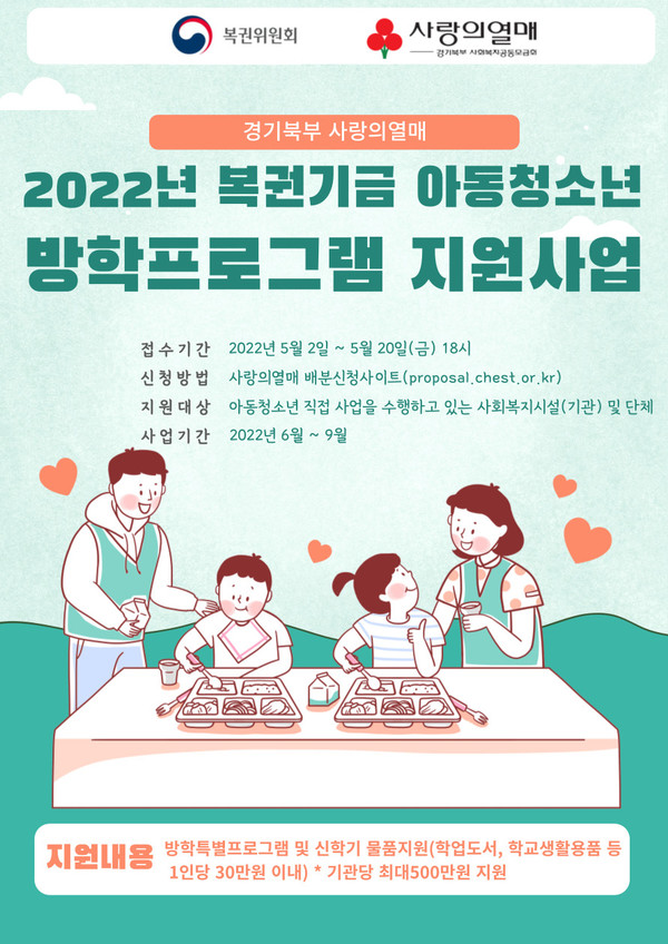 경기북부 사랑의열매(회장 이순선)가 취약가정 아동・청소년의 건강한 방학 나기를 위해 오는 20일까지 ‘2022년 복권기금 아동・청소년 방학프로그램 지원사업’ 공모를 한다. 이번 공모는 저소득 아동·청소년들에게 방학 기간 동안 프로그램과 체험학습 지원으로 교육 기회를 제공하고, 신학기 필요 물품 지원으로 학습 환경을 개선하는 사업이다.