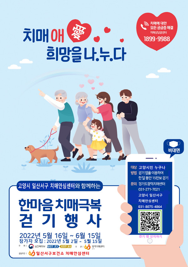 2022년 비대면 한마음 치매극복 걷기 행사에 대한 자세한 사항은 일산서구 치매안심센터(goyangiss.nid.or.kr)와 일산서구보건소 홈페이지(www.goyang.go.kr/health)에서 확인할 수 있다.