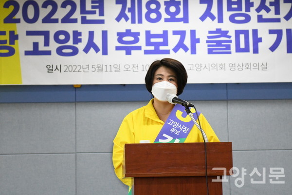 [고양신문] 김혜련 정의당 고양시장 후보가 11일 출마 기자회견을 열고 본격적인 선거운동에 돌입했다. 당초 양당 구도로 예상됐던 이번 시장선거에 제3지대 후보로 정의당이 나서면서 선거판도에 어떤 영향을 미칠지 관심이 모아지고 있다.