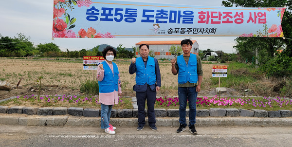 송포동 주민자치회(회장 이희재)가 지난 5월 11일 쾌적한 마을환경 조성을 위해 주민자치회 위원과 주민 등 10여 명과 함께 쓰레기 상습 투기지역에 화단을 조성했다. 화단을 조성한 곳은 송포동 도촌마을로 그동안 쓰레기 무단투기로 인한 마을 미관 훼손으로 지속적으로 민원이 발생했던 곳이다.