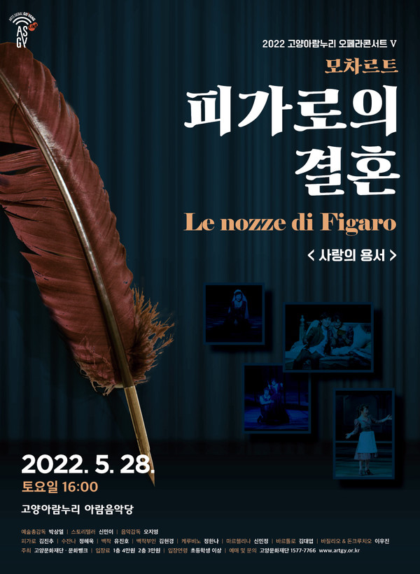 [고양신문] 모차르트의 가장 인기 있는 오페라 작품인 <피가로의 결혼>이 오는 28일(토) 오후 4시 고양아람누리 아람음악당에서 공연된다. 지난해에 이어 고양문화재단이 마련한 ‘2022 아람누리 오페라 콘서트 시리즈’의 첫 무대를 장식할 이번 무대는 아름다운 레퍼토리와 흥미진진한 스토리텔링을 아우른 대중친화형 작품으로, 국내 최고 수준의 음향을 자랑하는 아람음악당에서 저렴한 입장료로 오페라의 정수를 느낄 수 있을 것으로 기대를 모은다
