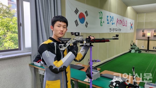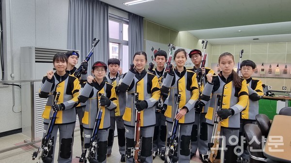 [고양신문] 한수중학교(교장 김규태) 사격부 선수들이 본관 2층 사격실에서 과녁을 응시하며 훈련에 집중하고 있다. 5월 28일부터 31일 포항(경상북도 일원)에서 열리는 제51회 전국소년체육대회에 전승호(3학년), 최예인(2학년) 선수가 경기도 대표로 선발돼 출전을 앞두고 있기 때문이다.