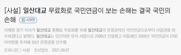 일산대교 무료화는 지방선거 투표일을 1달 앞둔 4월까지만 해도 국민의힘이 반대하던 민주당의 주요 공약이었다. 이재명 대선 후보가 추진했던 사업이라 주목을 많이 받았고, 반대로 국민의힘과 조선일보 등의 보수매체는 ‘국민연금에 손해를 끼치게 돼 결국엔 국민이 손해를 보게 된다’라며 반대여론을 조성하는 데 집중했다.
