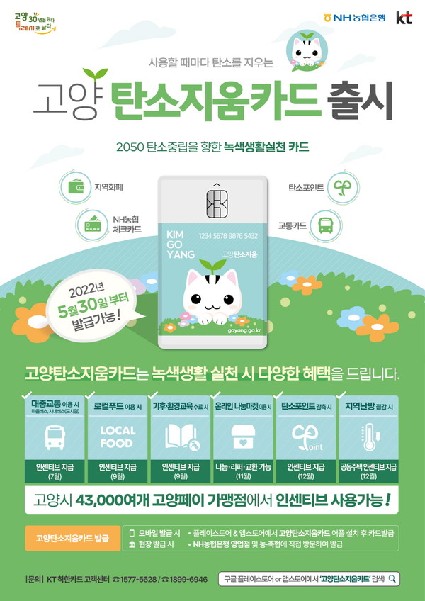 [고양신문] 대중교통을 이용하거나 난방사용을 줄이기만 해도 카드포인트를 얻을 수 있다? 고양시가 5월 30일부터 발급하는 ‘고양탄소지움카드’에 관심이 높아지고 있다. 녹색생활 실천으로 탄소배출도 줄이고 생활에 도움 되는 인센티브도 제공 받는 이 사업은 그동안 기후변화 대응정책에 앞장서 온 고양시가 내놓은 야심찬 작품이다. 특히 다양한 시민참여를 통해 탄소배출 줄이기를 시도할 수 있다는 점에서 주목받고 있다.