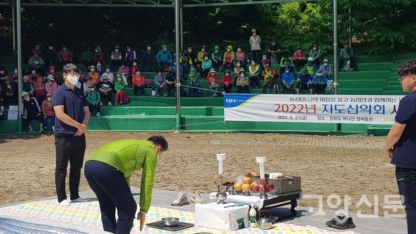 오명호 전 이사는 “이곳 마니산 기슭에 정성으로 준비한 제물을 마련해 천지신명과 산신령님께 술잔을 올리고 엎드려 고한다”며 “우리 지도농협 산악회원의 건강과 소통을 위해 언제 어디서나 산행의 안전을 살펴주시고 산악회의 무궁한 발전을 도와달라”고 축문을 낭독했다.