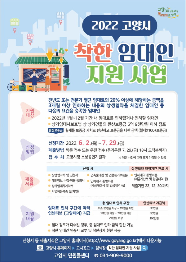 신청 모집 기간은 6월 2일부터 7월 29일까지로 신청 희망자는 고양시 소상공인지원과에 신청서와 상생협약서, 임대차계약서 사본, 임차인 사업자 등록증, 건물 등기부등본 등을 제출하면 된다. 신청 서류는 고양시청 홈페이지(www.goyang.go.kr) 고시‧공고란에서 확인할 수 있다.