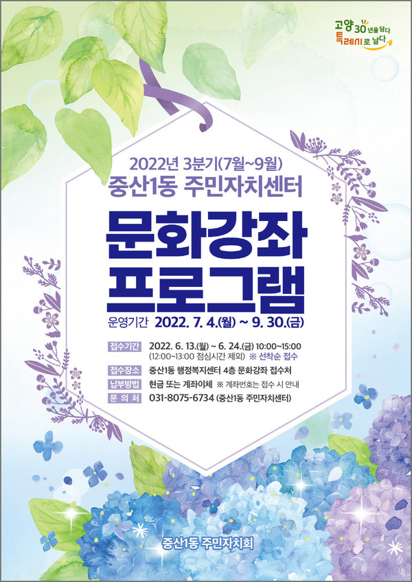 중산1동 주민자치센터 문화강좌 프로그램 접수는 6월 24일까지 매일 오전 10시~오후 3시(12시~1시 제외)에 중산1동 행정복지센터 4층 접수처에서 진행되며, 자세한 내용은 고양시청 홈페이지 내 중산1동에서 확인이 가능하다.