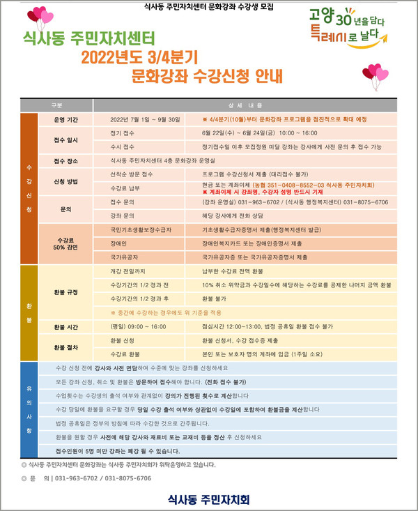 주민자치센터 문화강좌 프로그램과 신청에 관한 자세한 내용은 식사동 행정복지센터 홈페이지와 주민자치센터 내 전단지에서 확인할 수 있다.
