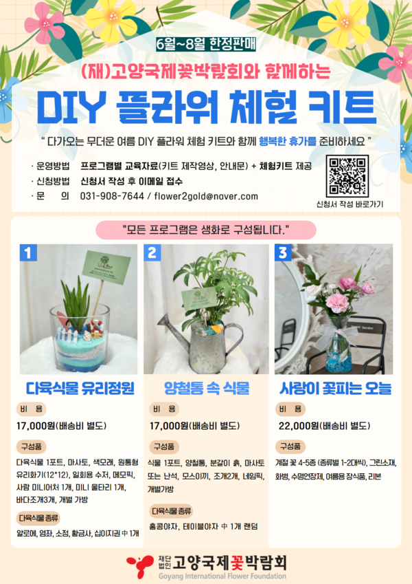 한편, 8월 말 여름 특별 프로그램 종료 후에는 가을꽃 등 시즌 화훼류를 활용한 DIY 플라워 체험 키트로 변경되어 12월 초까지 운영될 예정이다. 문의는 고양국제꽃박람회 사업2팀 031-908-7644로 하면된다.