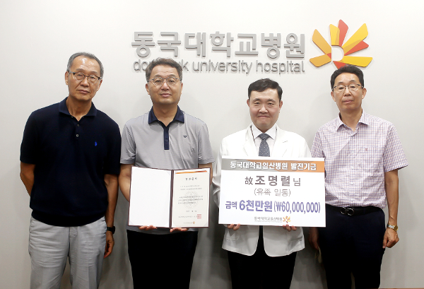 [고양신문] 故 조명렬 교수의 유족들이 동국대학교일산병원에 6000만원을 기부했다. 지난 11일 동국대일산병원 제1회의실에서 진행된 기부금 전달식에는 故 조명렬 교수 가족들, 권범선 병원장, 지도법사 능지스님 등이 참석했다.