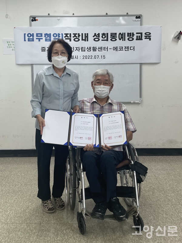 [고양신문] 즐거운장애인자립생활센터는 성폭력 예방 교육기관인 사단법인 ‘에코젠더’와 직장내 성희롱 예방교육에 대한 업무협약을 지난 15일 체결했다.