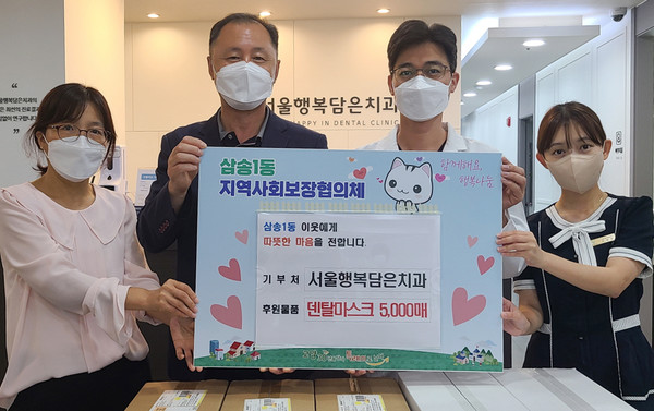 서울행복담은치과의원(이하 행복담은치과)이 지난 7월 21일 지역의 저소득층을 위한 덴탈마스크 5,000매를 삼송1동에 후원<사진>했다. 행복담은치과는 삼송1동 행정복지센터와 연말마다 저소득층을 위한 구강 검진과 스케일링을 무료로 실시하는 등 어려운 이웃을 위해 나눔을 실천하고 있다. 작년 5월에는 가정의 날을 맞이하여 300만 원을 기부했다.