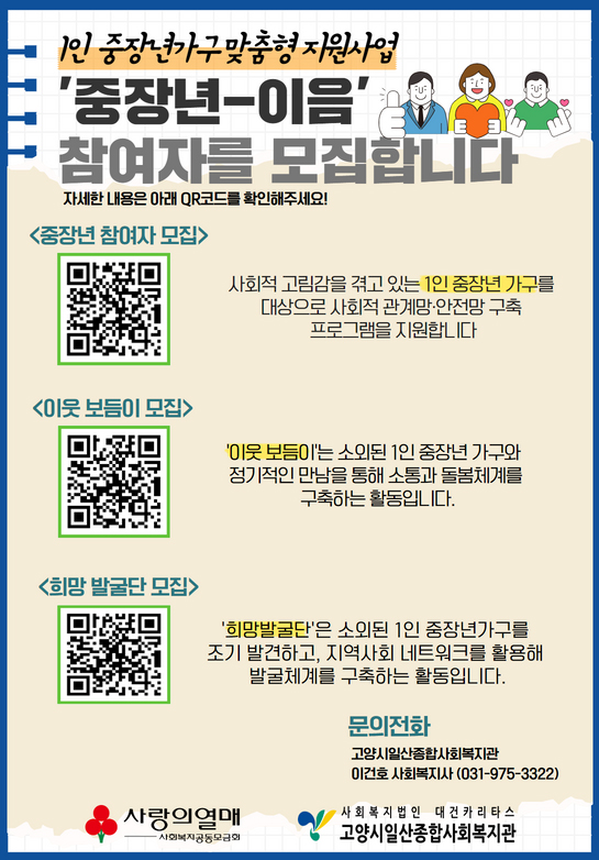 희망 발굴단 활동은 소외된 1인 중장년 가구를 조기에 발견하고, 지역사회 네트워크를 활용해 발굴체계를 구축하는 활동이다. 또한, 이웃 보듬이 활동은 소외된 1인 중장년 가구를 정기적인 만남으로 소통과 돌봄 체계를 구축하는 활동이다. ‘중장년-이음’ 1인 중장년 가구와 희망발굴단, 이웃보듬이 신청은 고양시일산종합사회복지관 방문과 전화, 홈페이지, 포스터 내 QR코드를 통해 신청할 수 있으며, 주변에 어려운 중장년이 있다면 누구나 추천이 가능하다.