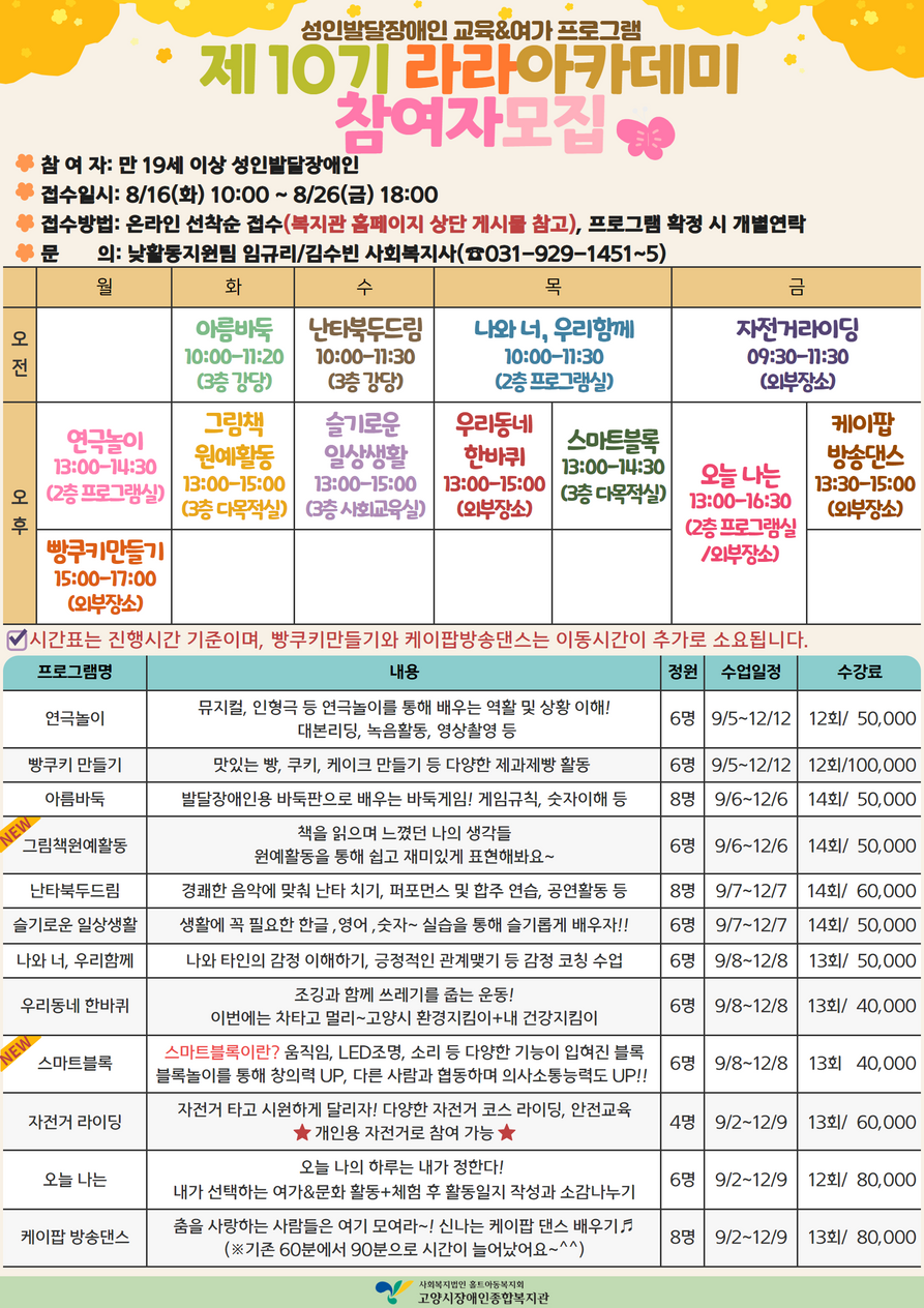 신청은 오는 8월 16일 10시부터 고양시장애인종합복지관 홈페이지를 통한 온라인 선착순 접수로 진행된다.