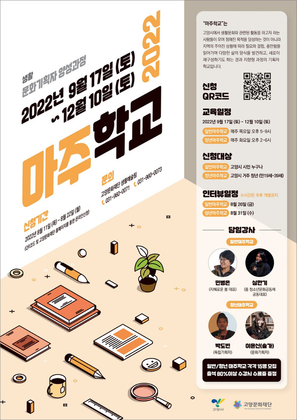 고양문화재단(대표이사 정재왈) 생활문화센터가 오는 8월 11일부터 22일까지 2022 문화기획자 양성아카데미 ‘마주학교’ 참여자를 모집한다. 마주학교는 9월 17일부터 12월 10일까지 총 11회차가 운영되며, 단순 기획자 인력에서 나아가 지역의 문화적 맥락을 읽어내는 리더를 양성하는 프로그램으로 진행될 예정이다. 과정은 ▲고양시 시민 대상 일반(성인) ▲청년(만 19세~39세) 2개 반으로 나누어져 운영된다.