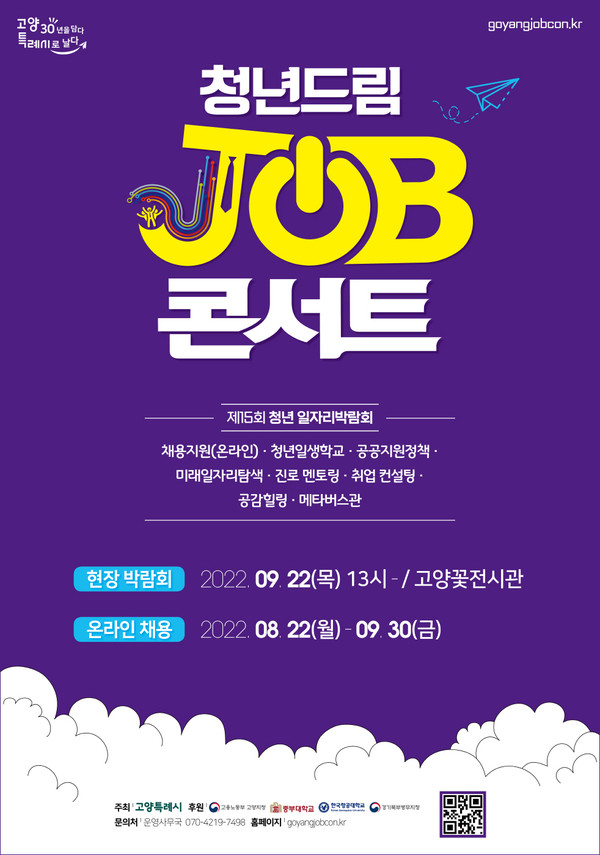 고양시가 청년일자리박람회 ‘청년드림 JOB콘서트’에 참여할 구인업체를 모집한다. 이번 청년드림 JOB콘서트는 ▲구인기업의 채용을 지원하는 온라인 채용 ▲고양시의 청년일자리사업 청년일생학교 ▲미래일자리탐색 ▲분야별 현직 직업인과의 진로 멘토링 ▲입사서류, 면접 클리닉을 지원하는 취업 컨설팅 ▲공공지원 정책 등의 주요 테마로 다채롭게 구성된다.