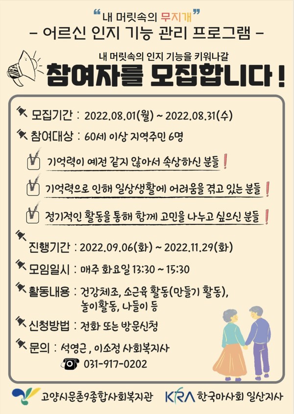 고양시문촌9종합사회복지관(관장 김신실)이 2022년 9월부터 2022년 11월까지 어르신 인지 기능 관리 프로그램 ‘내 머릿속의 무지개’ 사업을 진행한다. 이번 사업은 한국마사회 일산지사의 2022년 기부금 지원 사업의 일환으로 건강 체조와 소근육 활동(만들기 활동), 놀이 활동, 나들이 등 참여자의 인지 기능 관리를 위해 다양한 프로그램을 진행한다.