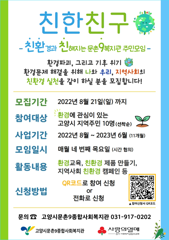 고양시문촌9종합사회복지관(관장 김신실)에서 2022년 8월부터 2023년 6월까지 ‘친한친구: 친환경과 친해지는 문촌9복지관 주민모임’ 사업을 진행한다. 이번 사업은 경기북부 사회복지공동모금회의 2022년 신규 기획지원사업의 일환으로 지역주민이 주체가 되어 생활 속에서 환경문제를 해결하기 위한 친환경 실천을 함께하는 활동이다.