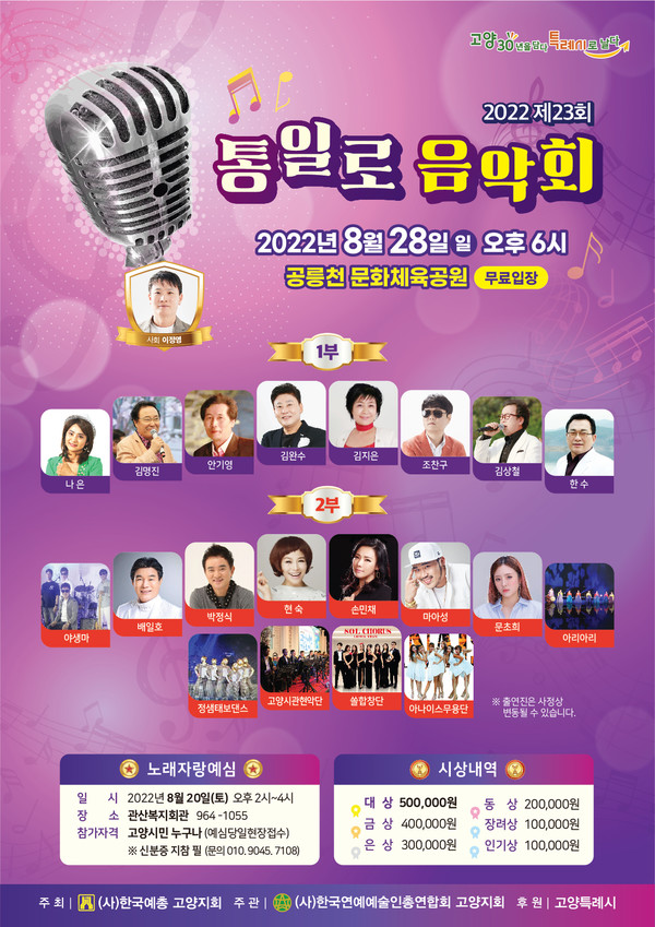 이날 사회는 입담과 재미가 가득한 방송인 이정영 씨가 진행한다. 통일로 음악회는 한국예총 고양지회가 주최하고, 한국연예예술인총연합회 고양지회가 주관하고 고양시가 후원한다.