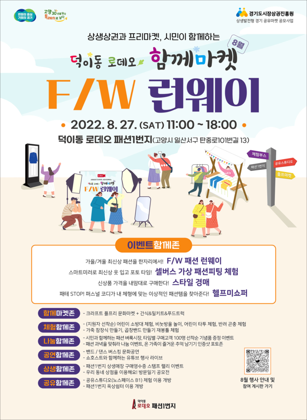 이번 ‘덕이동 로데오 함께마켓 / FW 런웨이’ 8월 행사는 각 학교의 개학 시기에 맞춰 진행되는 만큼 온 가족이 다채로운 문화행사에 참여해 즐기고, 더불어 지역 상권의 활성화를 돕는 의미 있는 주말 나들이가 될 것이다. 자세한 내용은 네이버 덕이동패션1번지 검색 후 공식블로그에서 확인 가능하다. (문의 : 031-917-6669)