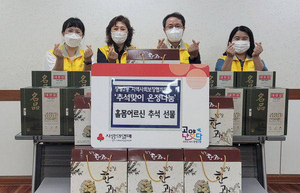 장항2동 지역사회보장협의체(위원장 이승희)가 9월 2일 ‘홀몸 어르신 추석선물 전달’ 행사를 진행했다. 이번 전달은 추석 명절에 외로이 지내실 기초생활수급자 홀몸 어르신 15명에게 추석 선물을 나누면서 따뜻한 이웃의 마음을 전달하고, 조금이나마 위로가 되고자 진행했다. 추석을 맞아 전달된 선물세트는 어르신들이 손쉽게 드실 수 있는 고급 김세트와 다양한 유과세트로 구성됐다.