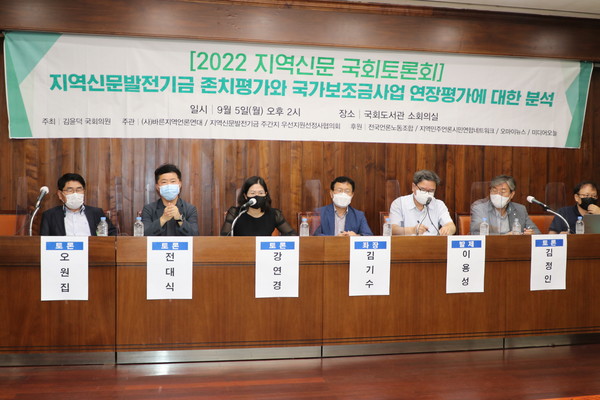 전국의 풀뿌리 지역언론인들은 지난 5일 ‘지역신문발전기금 존치평가와 국가보조금사업 연장평가에 따른 분석’을 주제로 국회 도서관 소회의실에서 토론회를 열었다. 이날 토론회에는 초강력 태풍 예고에도 불구하고 전국에서 100여 명의 지역신문 종사자가 참석해 기금존치평가와 국고보조사업 연장평가에 대한 분석에 이어 대안을 모색했다.