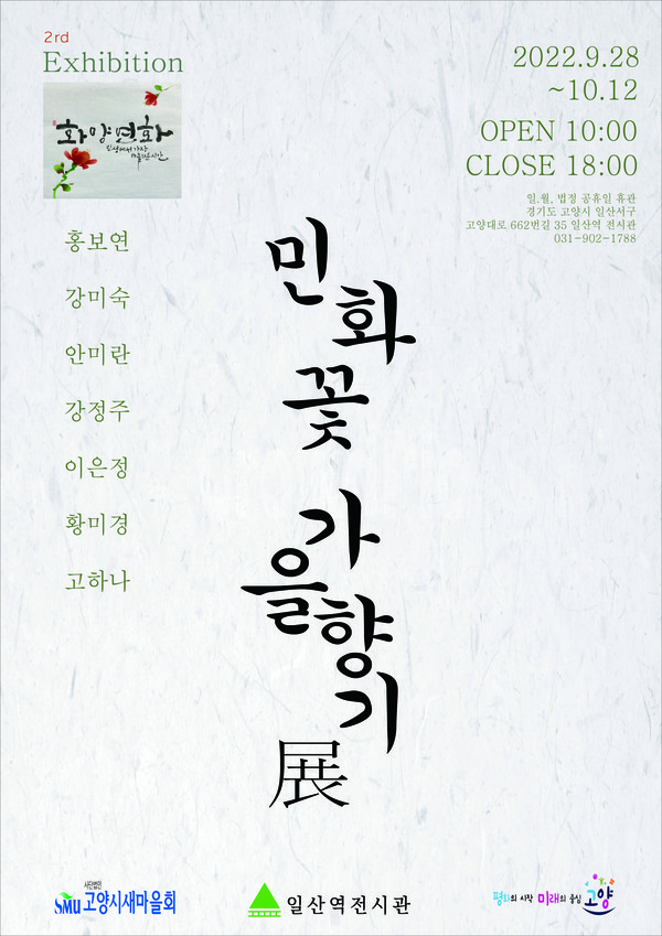 사)고양시새마을회(회장 김창규)가 위탁 운영하는 고양 일산역 전시관에서 9월 28일(수)부터 10월 12일(수)까지 고양시 시민 민화 작가들의 모임 ‘화양연화’의 ‘민화꽃 가을향기展’을 진행하고 있다. 이번 전시는 고양시 지역 내 홍보연, 강미숙, 안미란, 강정주, 이은정, 황미경, 고하나 민화작가 7인이 참여하는 단체전으로 꽃을 주제로 가을의 정취를 듬뿍 담은 꽃들을 민화로 선보인다. 이번이 두 번째 전시회인 화양연화회는 “가을로 가는 길에 때론 화려하게 때론 소박하게 그녀들의 향기로 일산역 전시관을 가득 채우고 싶다”라고 했다.