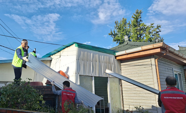 화전동 지역사회보장협의체와 고양신도라이온스클럽은 누수 피해를 입은 장애인 가정에 지붕 방수공사를 하고, 독거노인 가정에는 캐노피와 물받이를 설치했다. 더불어 방풍작업도 추가로 진행했다.