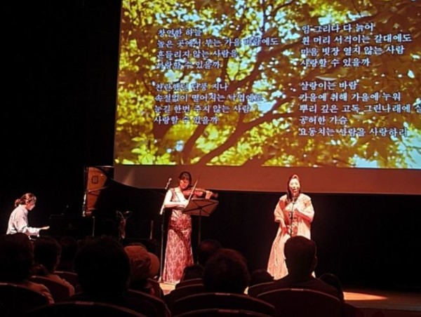 특히 이번 공연의 클라이맥스는 중견작가 공석진 시인의 시에 작곡가 라희가 곡을 붙힌 ‘가을 사랑’을 피아니스트 유건우와 바이올리니스트 이혜선의 연주와 함께 성악가 배성희의 노래로 부를 때였다. 노래가 끝나자마자 차분하게 진행되는 시·수필 낭송공연에서는 이례적으로 관객들이 환호성과 함께 기립 박수까지 유도하는 광경을 연출했다.