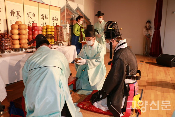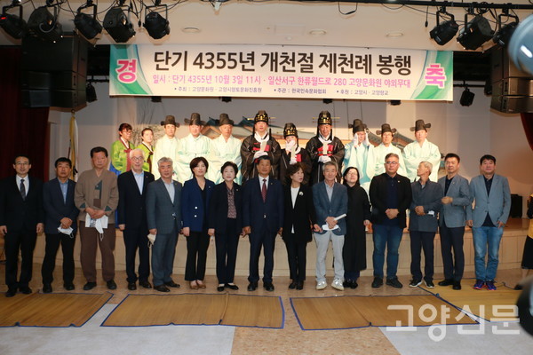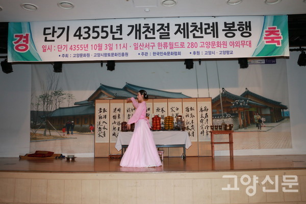 우리 민족의 첫 국가인 ‘조선’의 건국을 기념하는 개천절 제천례가 3일, 고양문화원 대강당에서 봉행됐다. 제천례 봉행의 초헌관은 이동환 고양특례시장, 아헌관은 김영식 고양특례시의회의장, 종헌관은 오영숙 고양시여성단체협의회장, 감제는 안재성 고양시향토문화진흥원장이 맡았고 제천례의 모든 행사는 고양향교(전교 강홍강)에서 맡아 진행했다.