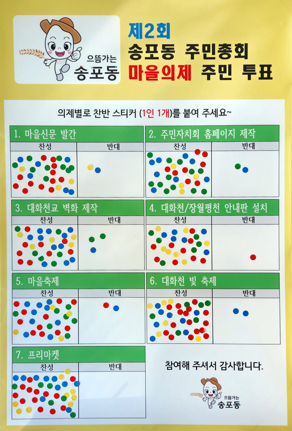 한편, 이번 마을의제 사전투표로 2023년 자치계획을 확정하는 ‘제2회 송포동 주민총회’는 오는 10월 29일(토) 오후 3시에 송포동 주민자치센터 2층 다목적실에서 개최된다.