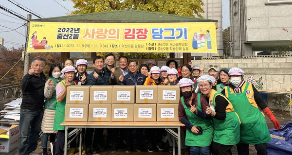 중산2동 새마을부녀회와 4개 직능단체(주민자치회·통장협의회·지역사회보장협의체·적십자봉사회) 회원들이 참여해 11월 8일과 9일 양일간 ‘2022년 사랑의 김장담그기’를 펼쳤다. 이날 행사에는 중산2동 직능단체 회원 40여 명이 이른 아침부터 약산마을 경로당에서 채소를 다듬고 양념 재료 등을 손수 준비해 300포기의 김장김치를 정성껏 담가 지역 내 저소득층과 독거노인 80가구에 전달했다.