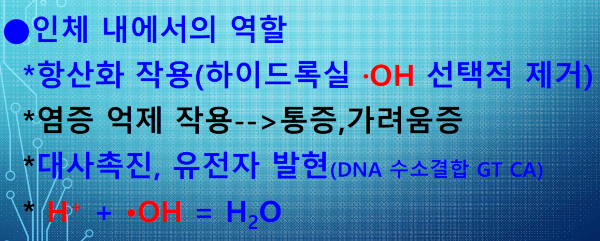 세상에서 가장 작은 항산화제인 수소는 혈액 속의 활성산소를 줄이고 노화를 방지해준다. 또한, 장내 이상 발효를 개선해줘 아토피성 피부염이나 치매도 예방할 수 있고 운동능력을 향상하며 피로회복에도 도움을 주는 것으로 알려져 있다. 이 교수는 심지어 심정지나 암 환자의 치료에도 수소가 사용되고 있다는 세계적 사례보고와 후속 연구들을 소개했다.