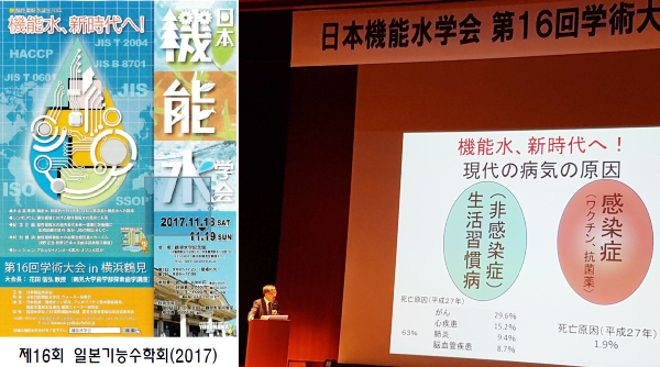 이규재 한국물학회 회장(연세대학교 원주의과대학 교수)은 ‘기능수 시대’를 제목으로 한 기조 강연에서 “수돗물과 정수물이 현대인의 설사병 예방과 탈수를 방지하는 안전한 물로 대중화됐지만, 이제 100세 시대가 되면서 노화를 억제하고 노화와 관련된 질환의 예방과 치료를 위해 항산화 효과가 있는 기능수의 중요성이 커지고 있다”고 강조했다. 수명이 늘면서 치매, 암과 같은 질병뿐 아니라 노화 자체도 병이 되는 시대가 됐기 때문에 생활습관과 연관된 질병 예방이나 치료를 위해서는 기능수와 같은 좋은 물을 찾아서 마셔서 근본적으로 면역력을 키워야 한다는 주장이다.