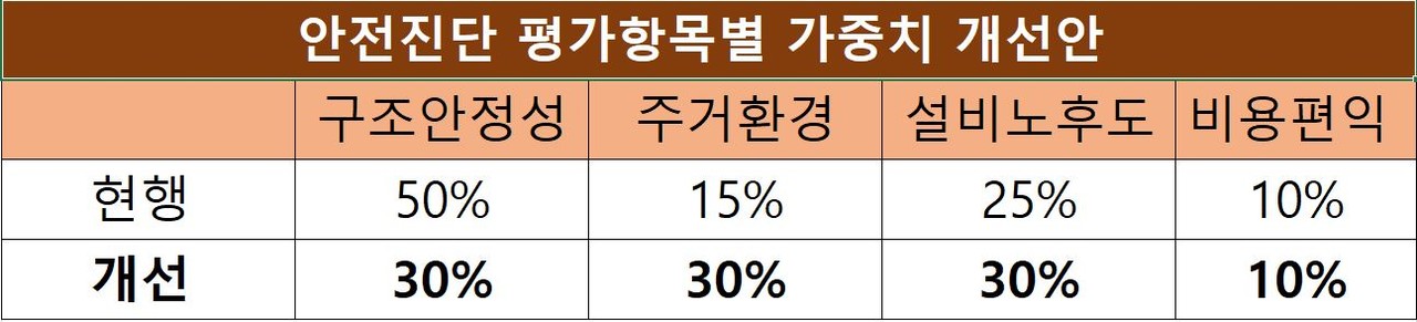 대신 주차대수·일조환경·층간소음 등을 평가하는 ‘주거환경’ 비중을 현행 15%에서 30%로 높였다. 또한 난방·급수 등 배관의 노후화를 평가하는 ‘설비노후도’ 비중도 현행 25%에서 30%로 높였다.
