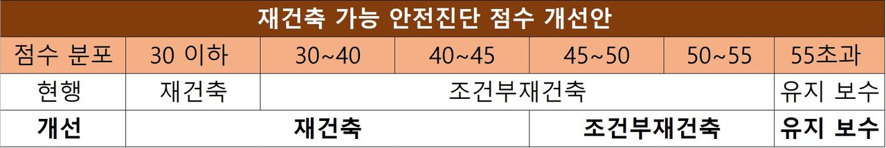 또한 재건축이 가능한 점수대도 넓어진다. 현재 안전진단 평가항목별 점수를 합산한 총점이 30점 이하인 경우 재건축 판정이 내려지는데, 앞으로는 45점 이하면 재건축 판정을 받아 사업을 할 수 있게 된다.