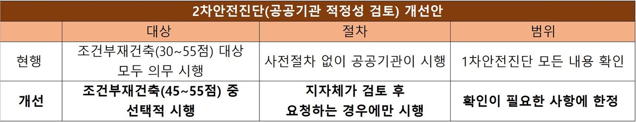 안전진단 평가 총점에서 ‘조건부재건축’의 범위도 축소된다. 현재 조건부재건축 판정을 받으면 의무적으로 2차안전진단을 받아야 한다. 국토안전관리원 등 공공기관이 적정성을 검토하는 2차안전단에서 재건축 불허 판정을 받는 경우가 허다했다. 하지만 새해부터는 조건부재건축 판정을 받더라도 2차안전진단이 의무사항이 아니게 된다. 지자체가 요청하는 경우에만 2차안전진단을 받도록 했다.