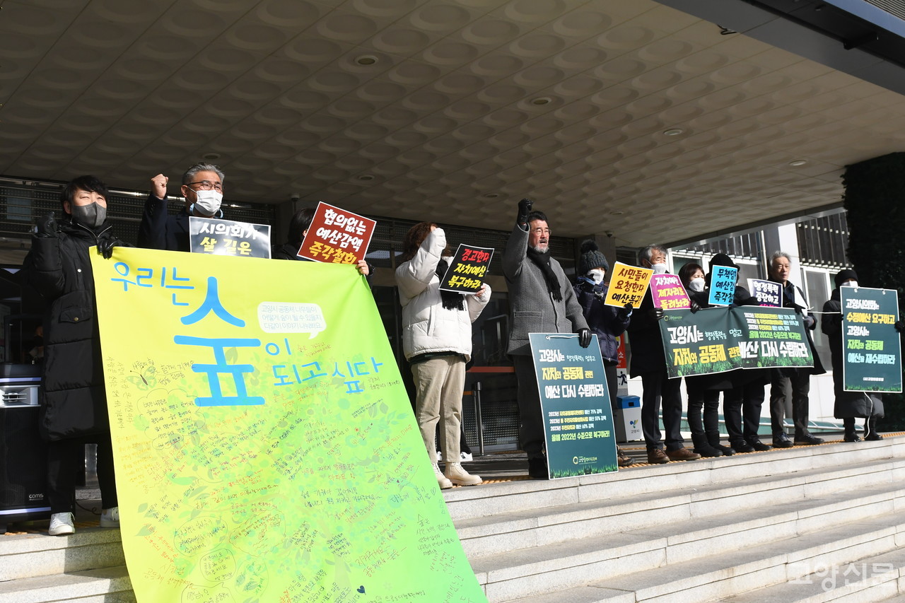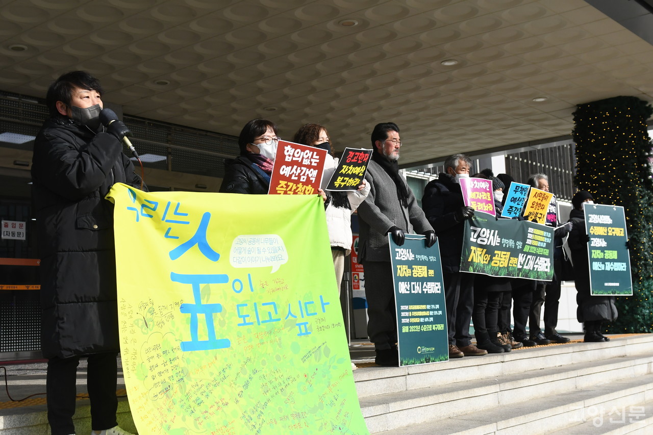고양시 자치공동체지원센터를 위탁하고 있는 (사)고양풀뿌리공동체, (사)고양마을포럼, 재미있는느티나무온가족도서관 등 지역 시민단체들은 19일 시청 앞에서 일방적 예산 감액에 대한 규탄과 올해 수준에 준하는 예산 재수립을 촉구하는 기자회견을 진행했다.