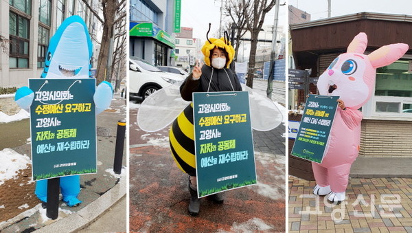 퍼포먼스에 나선 캐릭터 인형들의 모습은 귀엽고 재미났지만, 이들이 호소하는 목소리는 절박했다. 목에 걸고 있는 팻말에는 ‘고양시는 행정폭력을 멈추고 자치와 공동체 예산을 다시 수립하라’는 구호가 적혀있었다.